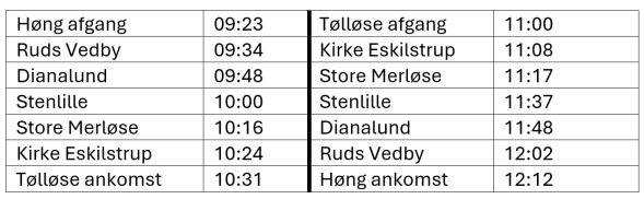 - Returbillet (Billettype A) gælder fra Høng, Ruds Vedby eller Dianalund til Tølløse og tilbage til udgangsstationen.